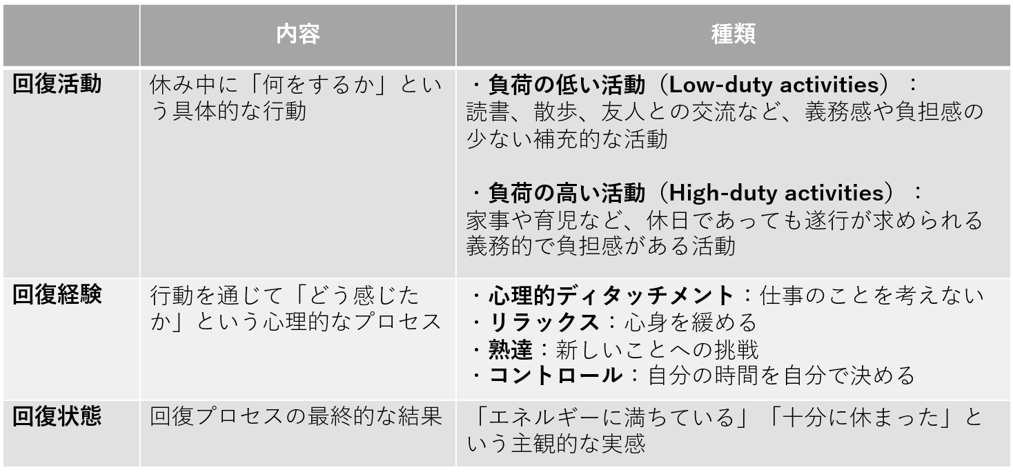 負荷の低い活動(Low-duty activities)は良好な「回復経験」を促し、それが最終的に「回復したという実感(回復状態)」へとつながります。