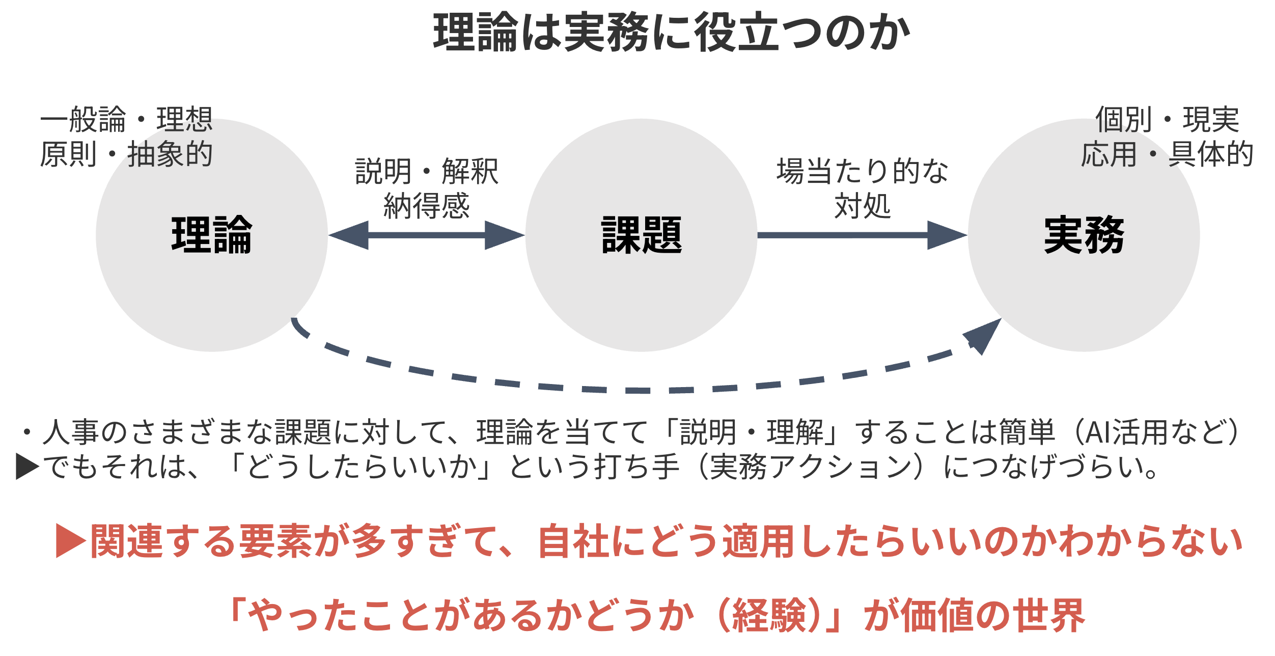 私は、人事の皆さんが日々向き合っている「ドロ臭い実務」は、まさにこの臨床の知の領域だと考えています。理論は重要ですが、理論だけでは橋を渡れない。その橋を渡るための骨組みが臨床の知だ、ということです。
