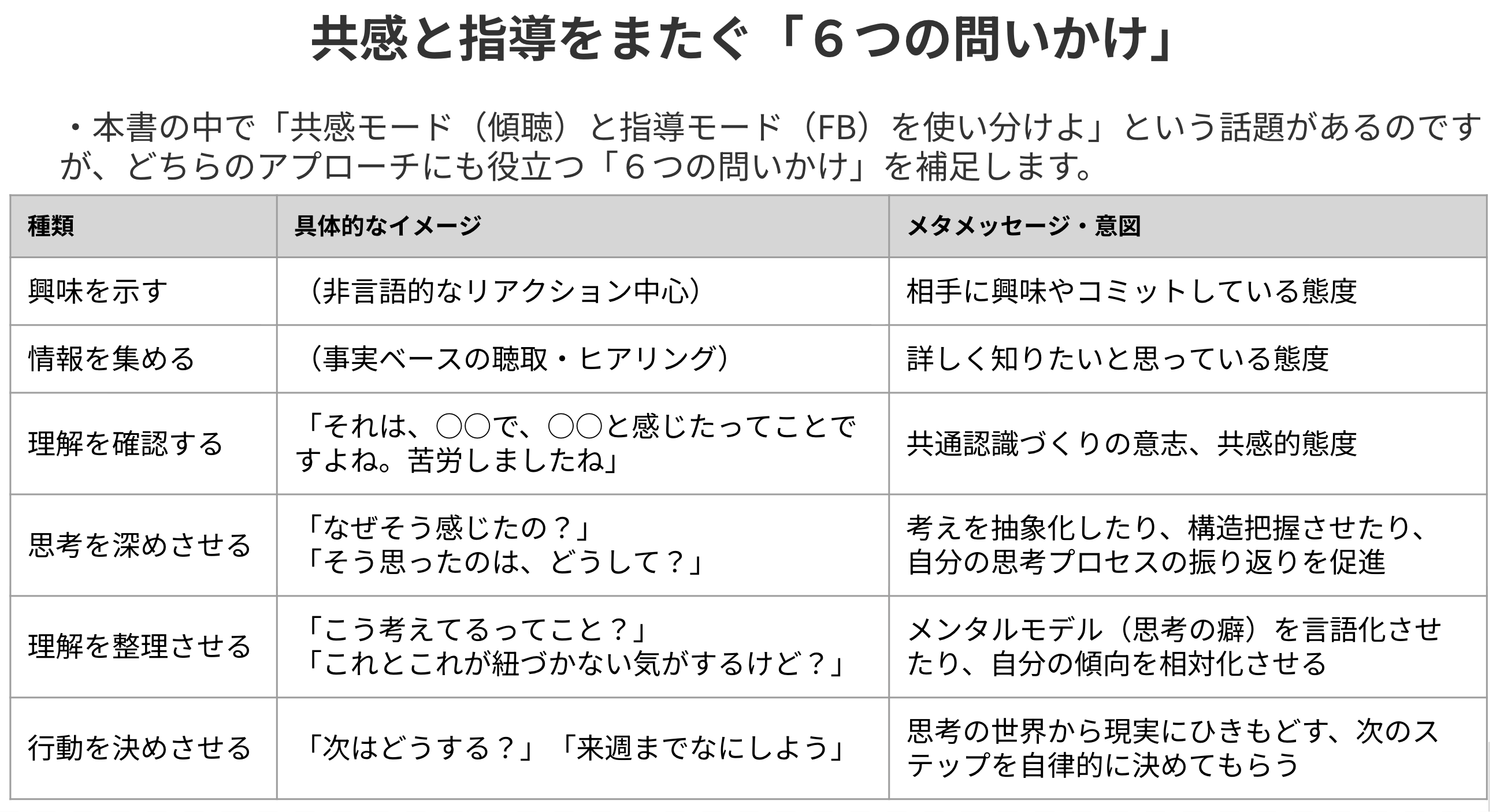 第4章では1on1を扱い、共感的に関わることと指導的に関わることを対比させています。ただ、その間をつなぐ「問いかけ」の整理はほとんど書けませんでした。そこで、私なりに問いかけを6種類にまとめて、今回初めて提示しました。