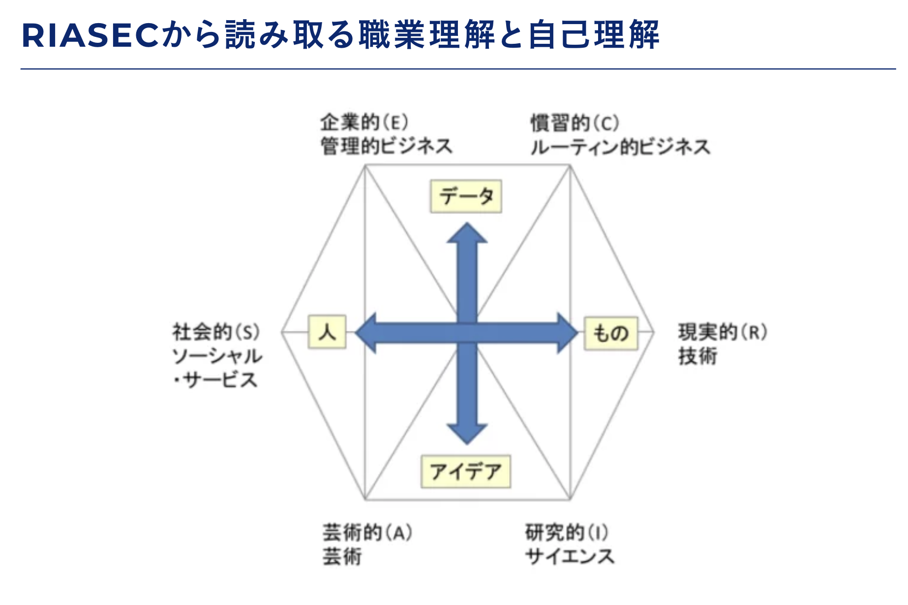 また、ホランドのRIASECモデルとして、興味関心の6つの方向性があるという理論もあります。対人的な方向性、ものづくり・技術的方向性、表現・芸術的方向性、オペレーション構築的な方向性など、興味の向きが違えば、仕事へのフィット感や満足にも影響します。ここも個別の意向度あげや入社後のマッチングに使える知見です。
